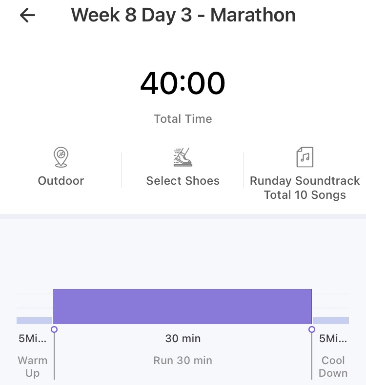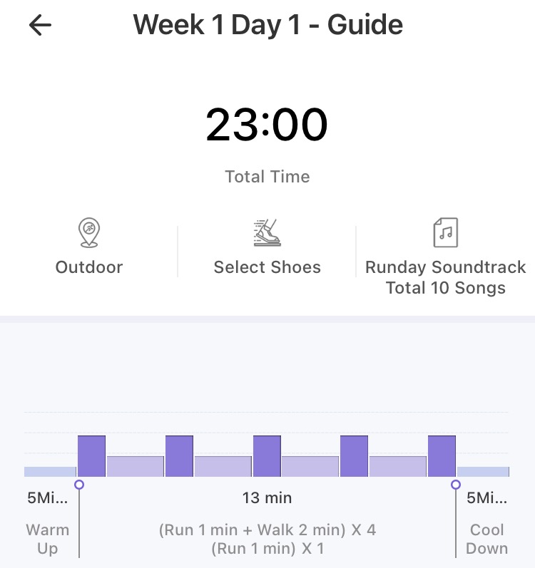 한 주에 3개의 트레이닝 코스가 있습니다. 첫 주는 5분 걷기 + (1분 뛰기 + 2분 걷기)*4 + 5분 걷기로 마무리입니다. 껌이라고 생각할 수 있지만 갈수록 뛰는 시간과 횟수가 늘어납니다. 총시간은 40분 내외로 소요됩니다